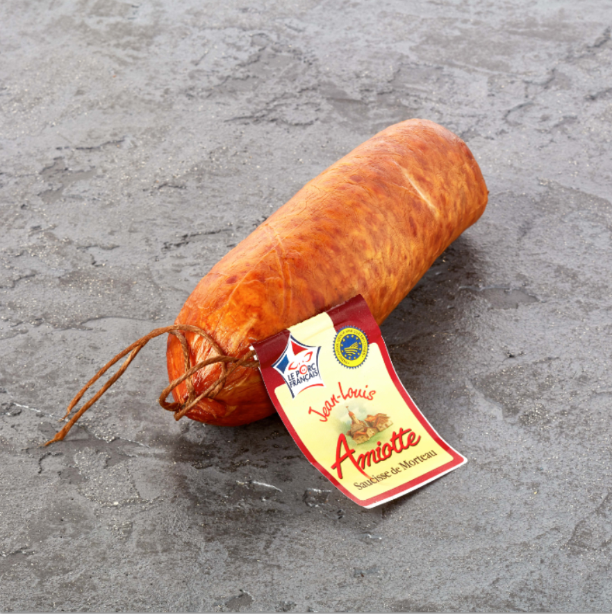 Véritable saucisse de Morteau IGP, reconnaissable facilement par son bâtonnet de bois, cette saucisse est comme la Montbéliard, 100% pur porc nourri au petit lait. Elle est fumée avec de la sciure de résineux dans un tuyé (pièce centrale des fermes du Haut-Doubs en Franche-Comté, notamment dans la région de Morteau).