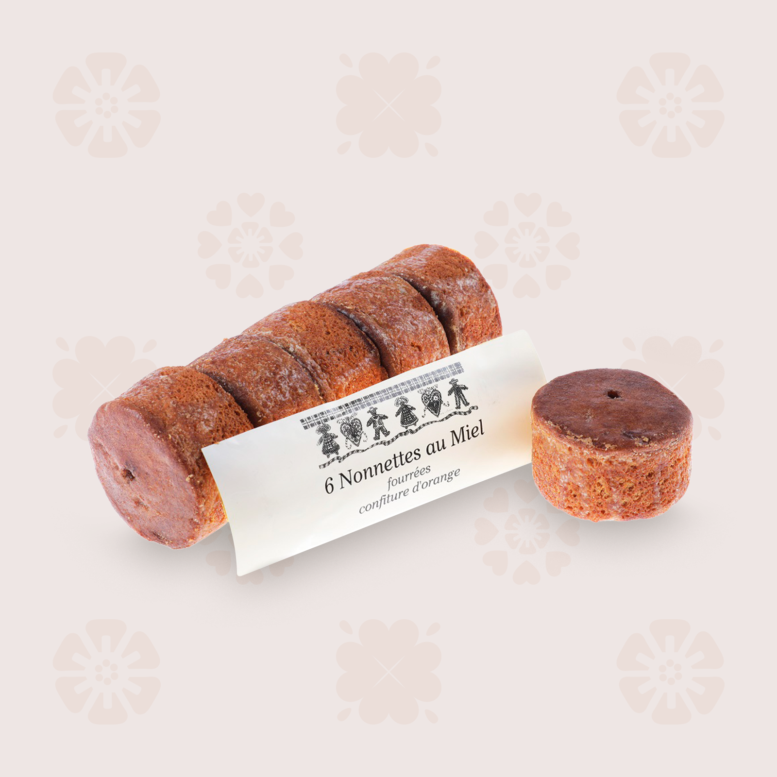 Pains d’épices moelleux au miel fourrés à la confiture d’orange. La nonnette est un pain d’épices rond cuit dans des moules individuels puis fourré de marmelade et nappé d’un glaçage.