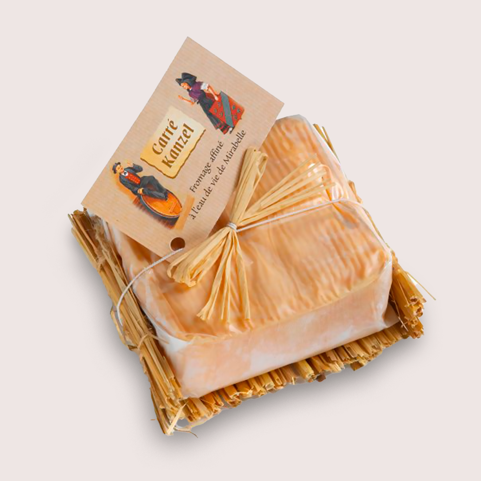 Le Carré Kanzel affiné à l'eau de vie est un fromage au lait de vache à pâte molle et à croûte lavée. Cette spécialité fromagère carrée est affinée dans les caves de la Maison Fisher, pendant environ 15 jours. Le carré est régulièrement frotté à l'aide d'eau-de-vie de mirabelle qui adoucit le fromage.