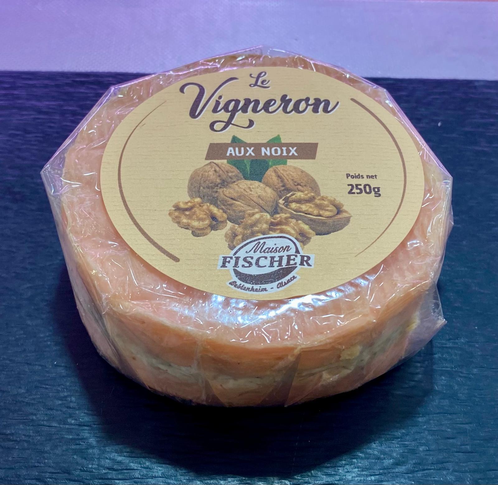 Découvrez le Vigneron aux noix de la Maison Fischer, un fromage élégant et gourmand qui marie à merveille le caractère du lait de vache et la richesse croquante des noix. Sa pâte fondante, parsemée de noix savoureuses, révèle des notes à la fois fruitées, lactées et légèrement boisées. Chaque bouchée offre un équilibre parfait entre douceur et intensité, pour un plaisir raffiné.