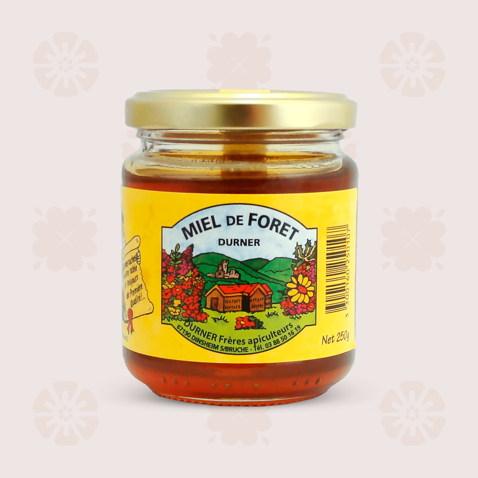 Le miel de Forêt est composé de miel de sapin et épicéa et des fleurs qui se trouvent dans les alentours. Son goût est un peu balsamique et boisé.