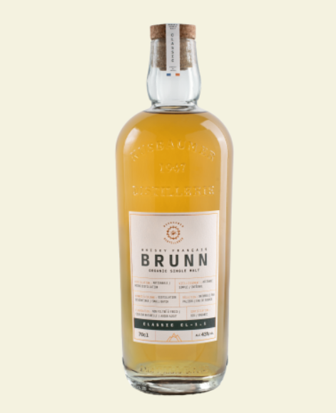 Le Whisky Brunn Classic de la distillerie Nusbaumer est un single malt biologique à 43 %, vieilli 3 ans en fûts de vins blancs de Bourgogne, sans filtration à froid ni colorant.