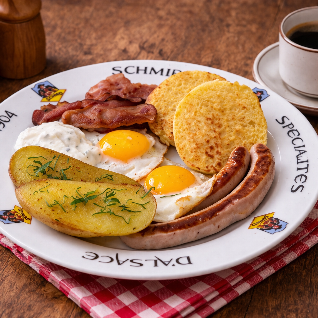 La poitrine fumée grillée et les saucisses de Nuremberg apportent caractère et gourmandise, tandis que la pomme de terre vapeur vient équilibrer l’ensemble avec simplicité.