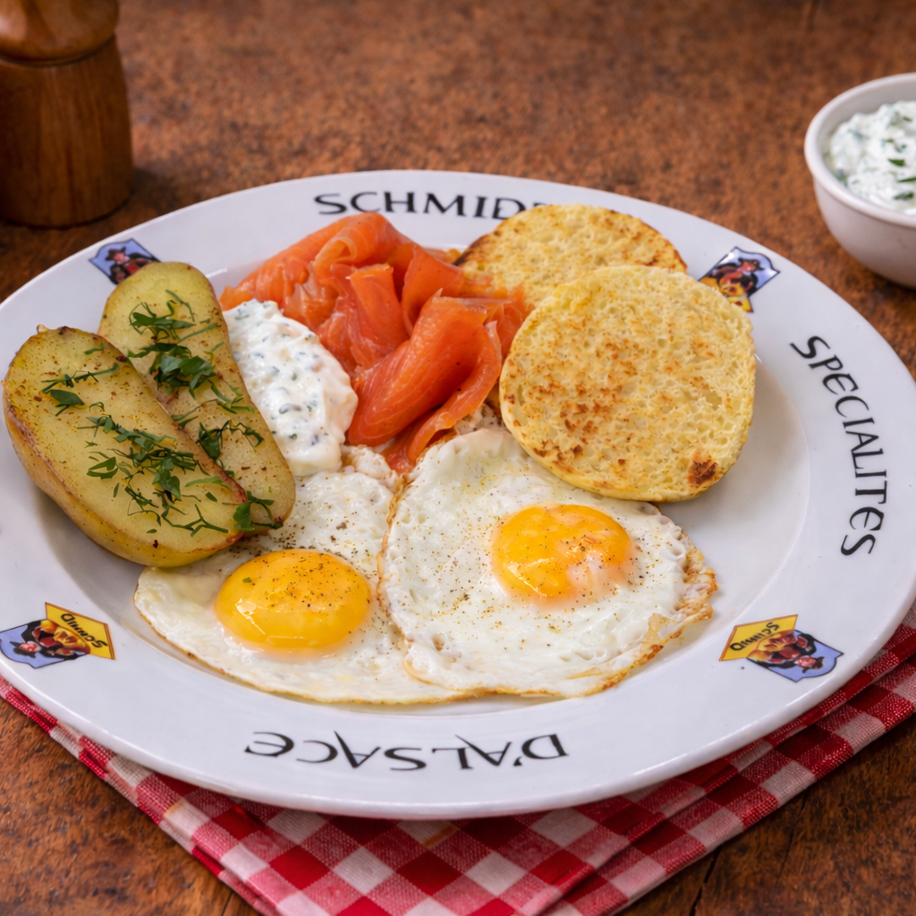 Le dampfnudle toasté, à la fois moelleux et délicatement doré, accompagne deux œufs au plat à la cuisson parfaite.