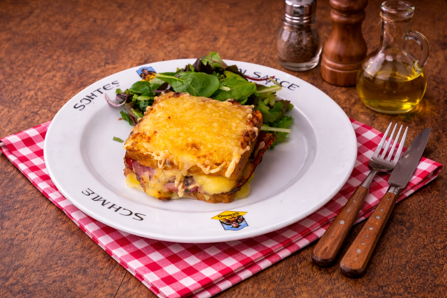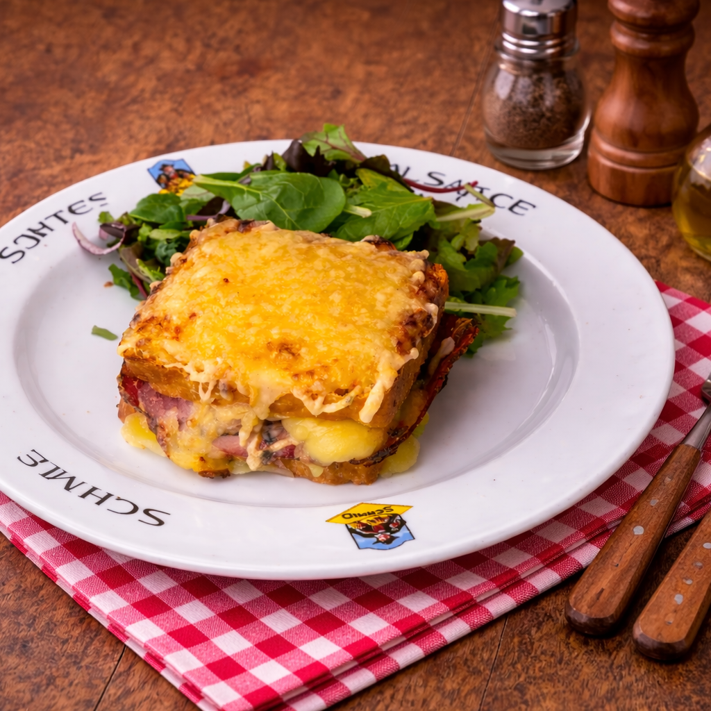 Le croque-monsieur se décline ici au pain kouglof salé, légèrement toasté, apportant une texture moelleuse et une note subtilement typée.