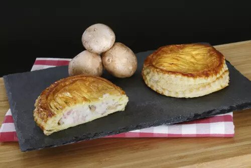 Feuilletage au beurre façonné à la main, garni de jambon et d’une farce de champignons.