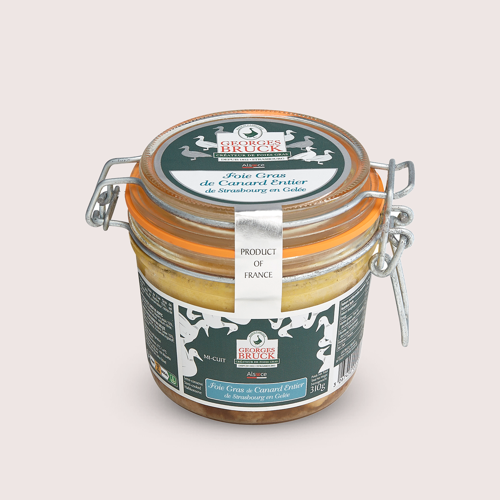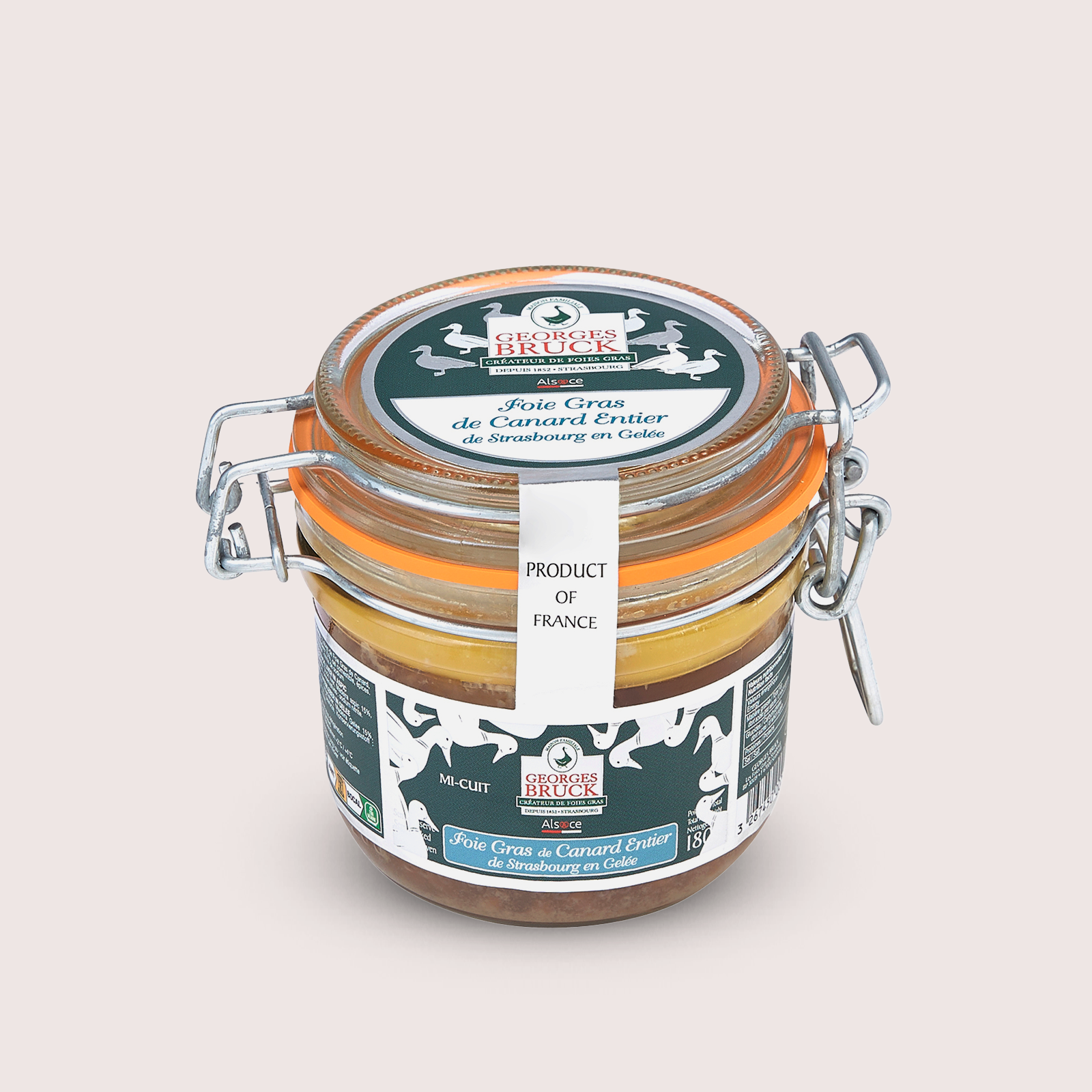 Ce foie gras de canard entier mi-cuit, cuisiné dans sa gelée au Madère, révèle une saveur prononcée avec une belle longueur en bouche, soutenue par la gelée au Madère.