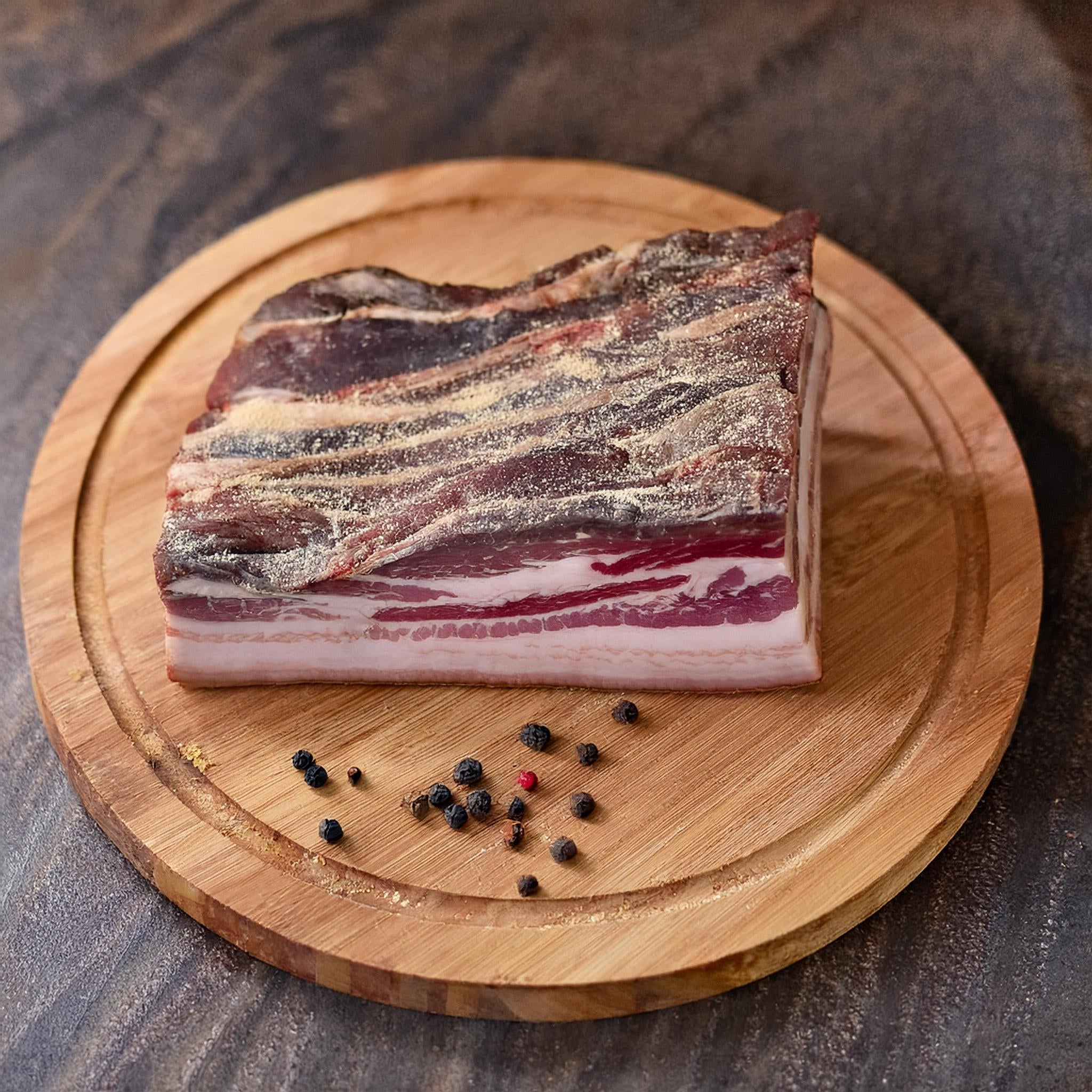 Grande spécialité alsacienne, le lard paysan est une poitrine de porc salée au sel sec puis fumée au bois pour offrir le vrai fumet d’autrefois. Un seul petit morceau cuit avec une soupe ou des légumes, leur communique un délicieux parfum. Tellement parfumé que vous pouvez en acheter pour toutes vos préparations.