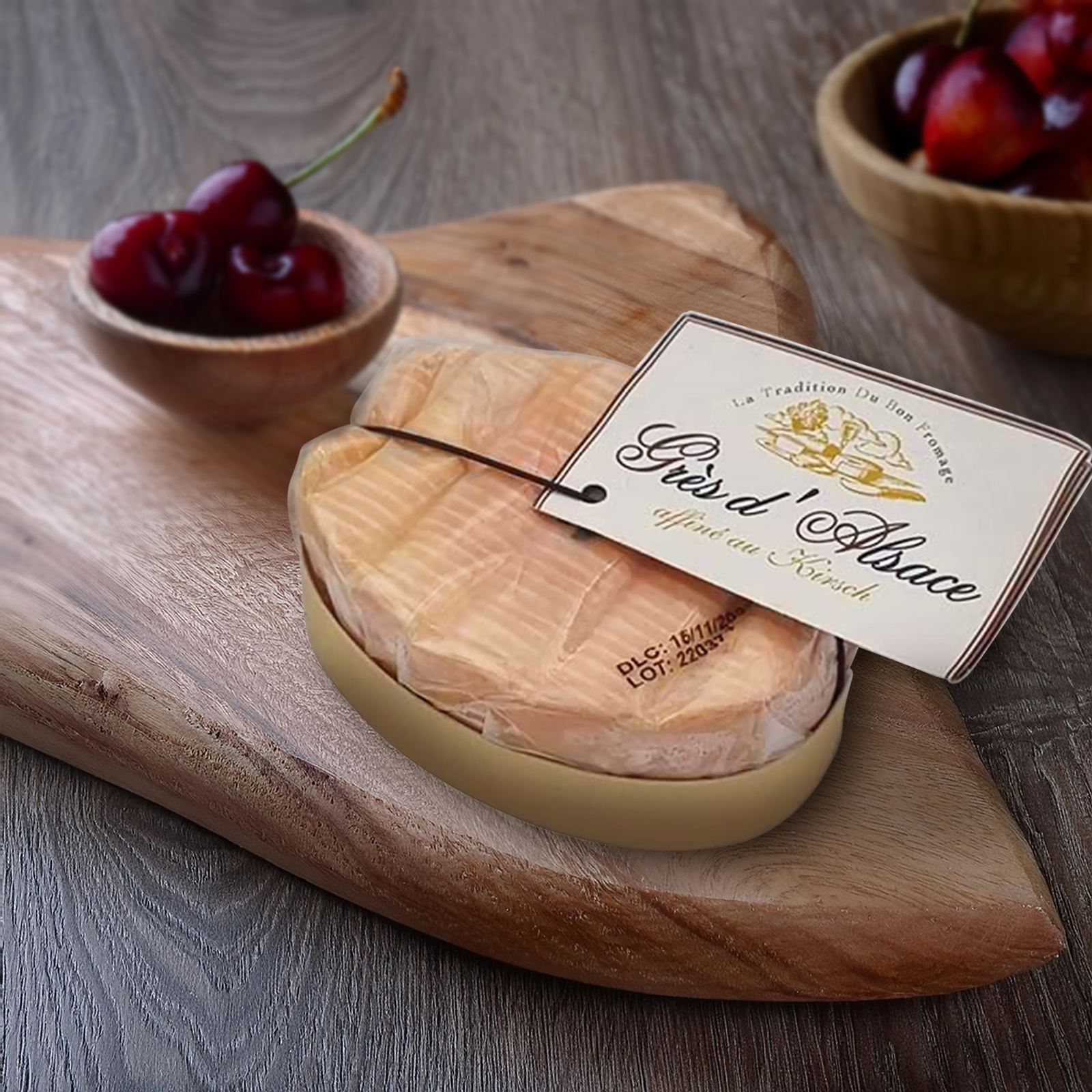 Le fromage affiné au Kirsh est un fromage relativement rare que nous vous présentons ici. Fromage issu de la région des Vosges (Alsace), il présente une belle croûte lavée, d’aspect huileux et collant. Son odeur est pugnace. La pâte est jaune clair et offre une souplesse et une élasticité incroyable. Une petite touche de kirsh est utilisée lors de l’affinage pour conférer à la pâte cet aspect gras. Il est également décoré avec une feuille de fougère. Pour les amateurs de fromages forts ! Si vous aimez les fromages type Munster, vous adorerez le Grés des Vosges.