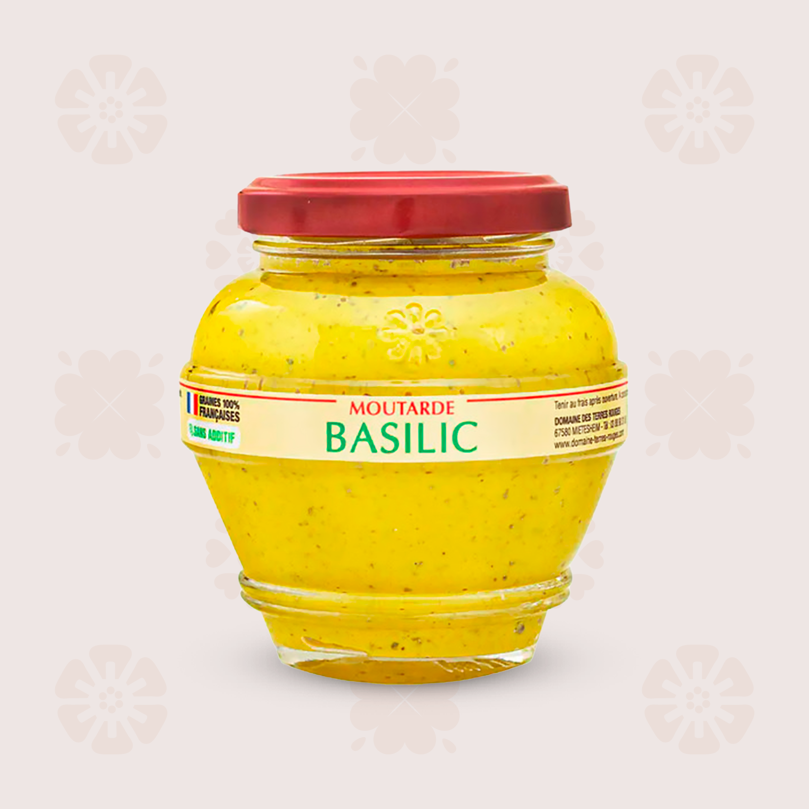 La moutarde Basilic du Domaine des Terres Rouges, est issue de graines cultivées exclusivement par des agriculteurs français, qui sont ensuite travaillées et moulues traditionnellement à la meule de pierre.