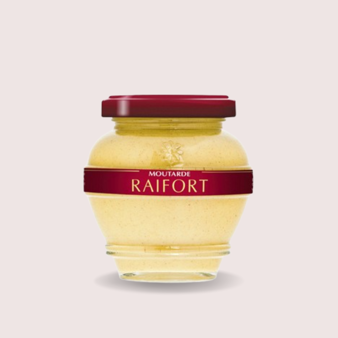 Le raifort est un condiment au goût piquant et très aromatique fabriqué à partir de la racine d'une plante. Les racines sont cultivées en Alsace, triées et coupées à la main avant d'être râpées et préparées. Profitez de cette moutarde sans colorants, sans conservateurs et sans additifs.