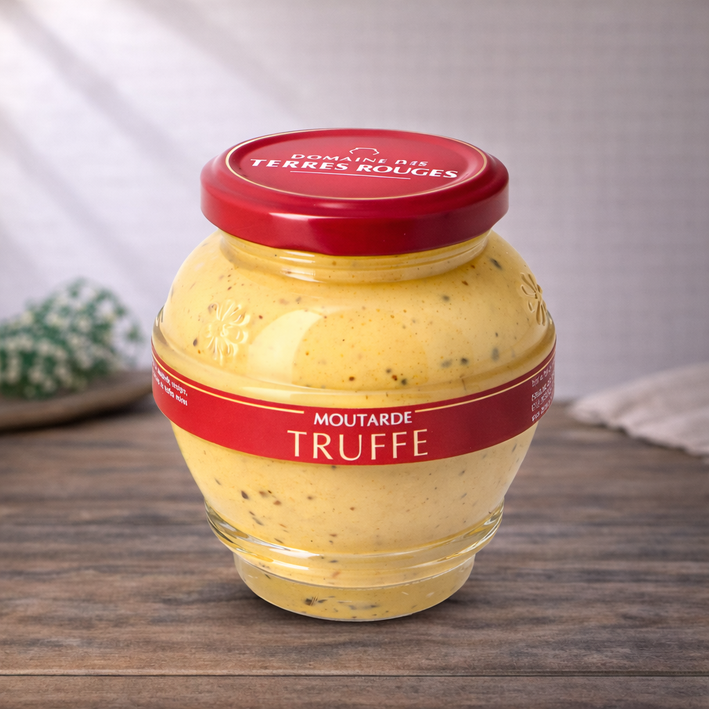 La moutarde à la Truffe Noire du Domaine des Terres Rouges, est fabriquée à partir de moutarde de Dijon mi-forte, à laquelle on a ajouté 3% de truffes noires d'hiver de Provence, la fameuse Tuber Melanosporum.