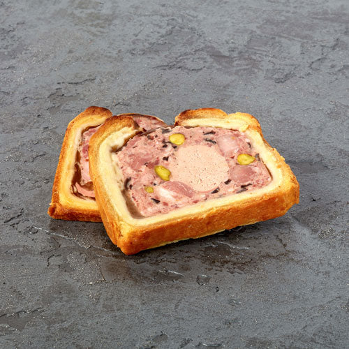 Le pâté en croûte “Richelieu” à la mousse de foie est façonné à la main. Il est constitué d’une couche croustillante de pâte feuilletée au beurre et d’une base de viande de porc d’origine française. Le centre de ce pâté révèle un médaillon rond de mousse de foie.