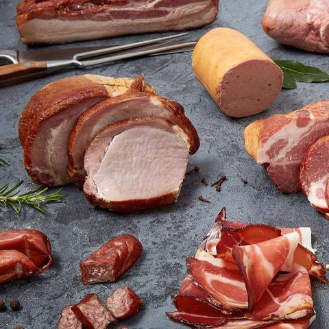 Jambon blanc fermier, Jambon cru d’Alsace, Jambon de le forêt noire, Assortiment roulades, Paire de gendarmes, Presskopf, Saucisse à tartiner, Saucisse de foie, Saucisson sec d’Alsace, Saucisson à l’ail.